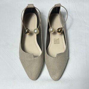 NIB Tan Flats with Pearl Accent Ankle T-Strap Detail Sz 39