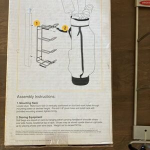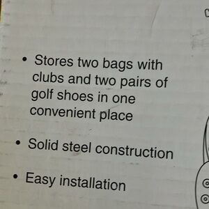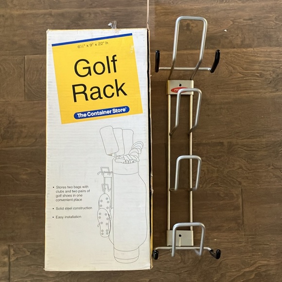 Stores two bags and two pairs of shoes. Sturdy steel golf rack from the container store. Ideal for organizing your space. new. Please see photos for details and measurements (on box).