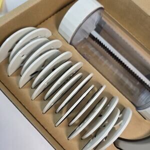 The Pampered Chef Cookie Press, retired model 1525, is a versatile baking tool perfect for all occasions. This standard-sized cookie press in white color features 16 design discs, making it easy to create delicious homemade cookies with intricate designs. Made of stainless steel and plastic, it is designed with a handle for easy use, and the non-stick coated surface makes it easy to clean. Perfect for Christmas and any season, this Pampered Chef Cookie Press is a must-have for any home baker looking to add a touch of festive fun to their baking repertoire.