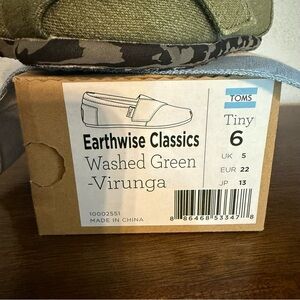 NIB Toms Earthwise Classics Washed Green Slip-Ons “Virunga” Baby/Toddler Size 6