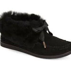 Plush rabbit fur trims the exterior and lines the interior of a cozy moccasin bootie slipper fashioned from dense Black Suede.