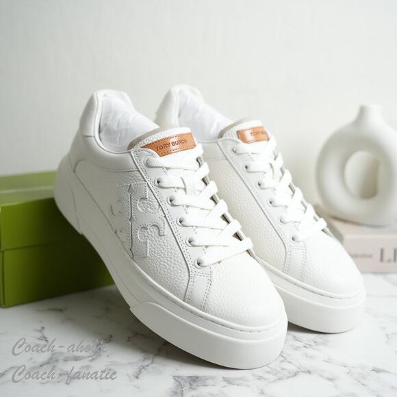 NIB Tory Burch Signature Color Block Platform Leather Sneaker Shoes in Snow Whit