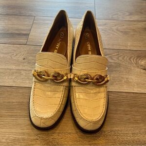 Set apart by exaggerated horse-head hardware, linked in brushed brass. The Jessa Pump elevates the classic loafer, in luxurious croc-embossed leather with a stacked block heel. Wear it with everything from feminine skirts and dresses to menswear suiting.