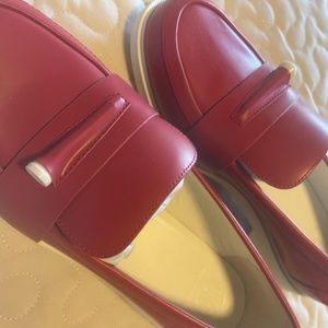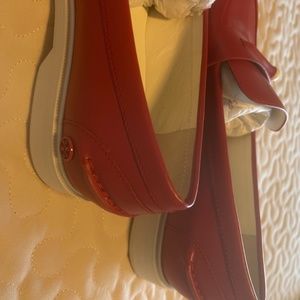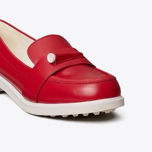 Tory Burch, Brand New in Box-Never Worn, Red/Carnation color with White Sole, Leather Golf Slip on with Pocker Tees.