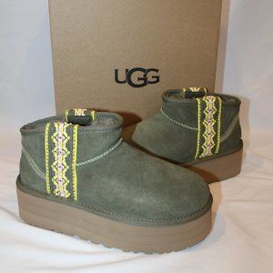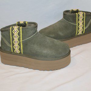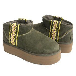 NIB UGG PLATFORM TASMAN BRAID ULTRA MINI SUEDE SHEARLING LINED BOOTS OLIVE GREEN