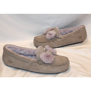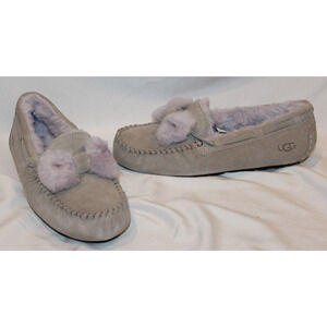 NIB UGG WOMEN'S DAKOTA SHEARLING BOW SUEDE INDOOR OUTDOOR SLIPPERS GOAT GRAY