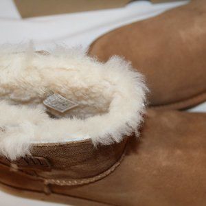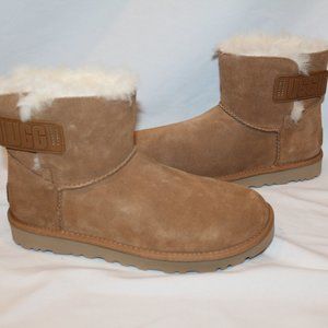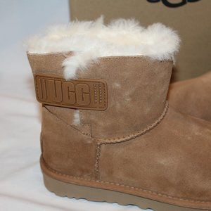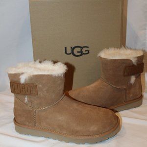 NIB UGG WOMEN'S MINI BUCKLE LOGO SUEDE SHEARLING LINED ANKLE BOOTS CHESTNUT