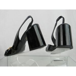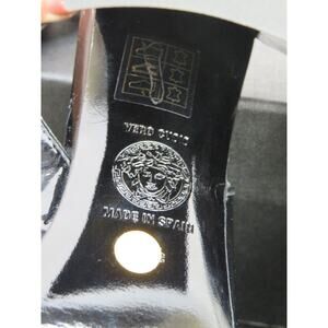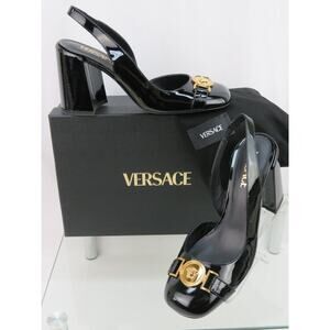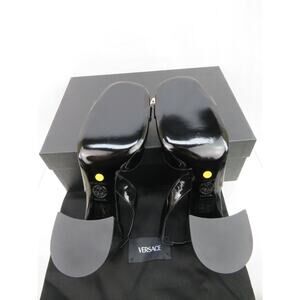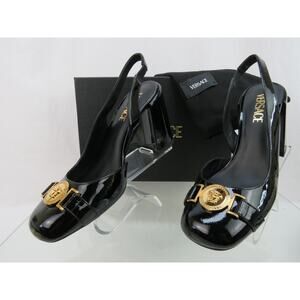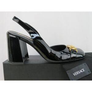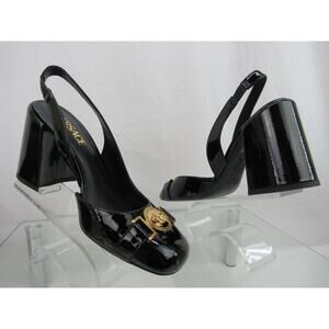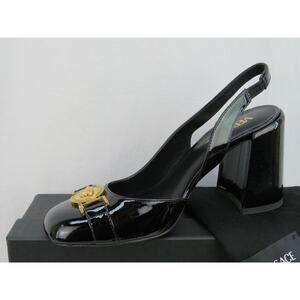 NIB VERSACE BLACK PATENT LEATHER GOLD MEDUSA LOGO SANDALS HEEL PUMPS 38.5 8.5
