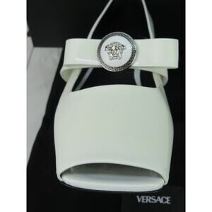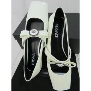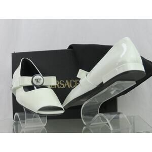NIB VERSACE WHITE PATENT LEATHER COIN MEDUSA HEAD LOGO BOW FLATS 39 9 ITALY