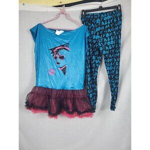 Your costume includes, a fun blue dress, a pair of black and turquoise letter leggings, a pink glovelette, and a matching belt.