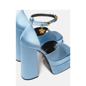 Step into show-stopping glamour with these authentic Versace Aevitas Platform Sandals, crafted in luxurious ice light blue satin. This bold runway-inspired style features a dramatic double platform, towering block heel, and an ankle strap adorned with signature crystal charms.