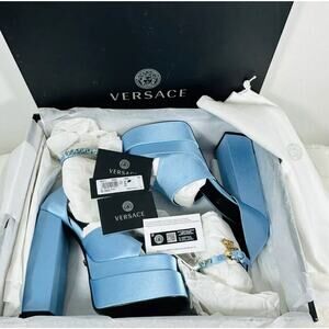 NIB Versace Aevitas EU 38.5 US 8.5 Platform Sandals Satin Crystal Light Blue $1,475
