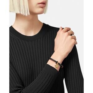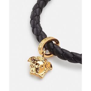 Authentic Versace La Medusa Bracelet, blending luxurious Italian craftsmanship with iconic house style. This striking bracelet features a black braided leather band accented by a gleaming gold-tone Medusa charm, a symbol of power and timeless Versace allure.