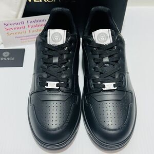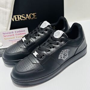 Authentic Versace Medusa Logo Leather Sneakers, crafted from smooth black leather and detailed with the iconic Medusa emblem. These low-top sneakers feature a lace-up front, embossed logo accents, and a sturdy rubber sole that blends comfort with signature Versace style.