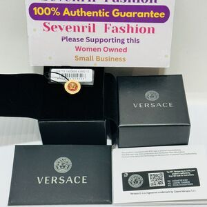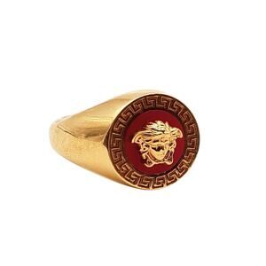 Make a bold statement with this Authentic iconic Versace Icon Medusa Head Greca Engraved Ring. Crafted in Italy, this designer piece features the legendary Medusa head surrounded by Versace’s signature Greca motif, finished in polished gold-tone metal. A timeless symbol of power and luxury, this ring embodies Versace’s unmistakable craftsmanship and bold aesthetic. And perfect for gifting or completing any high-fashion look.
