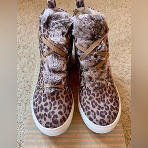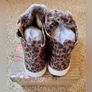 Stylish leopard print high-top sneakers with faux fur lining. Perfect for a trendy look.