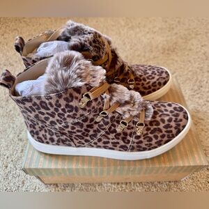 NIB, Very G “Shayne” Leopard Print Fur-Trimmed Women's Sneakers