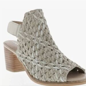 Very Volatile Brinkley Woven Leather Mules in Stone are made of genuine leather and rubber and are available in size 8. They have a 2.75-inch heel, a padded footbed, and a velcro closure on the heel strap.