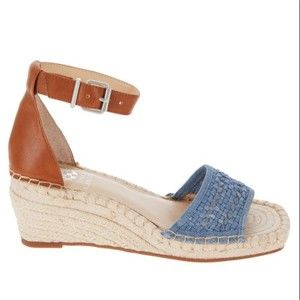 Color: Eyelet Denim Light Blue/Barn Brown Upper:Manmade or textile (Denim) Design:Espadrille sandal Closure:Buckled ankle strap Toe Type:Open, square Back:Closed Lining:Manmade Insole:Padded Sole:Manmade Back Heel Height:Approx. 2.2"H jute/rope-covered wedge heel