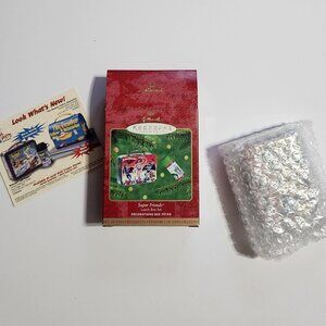 2 Pieces! Hallmark Keepsake Ornament - Super Friends working tin lunchbox with matching thermos. Still in its original wrapping. N4613