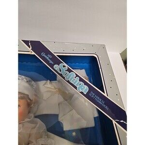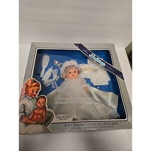 This is a NIB vintage Goldberger baby doll, measuring 11 inches in length and height. The doll has blonde straight hair and beautiful blue eyes. The doll's complexion is light, and she is dressed in a lovely dress. This original and licensed reproduction doll belongs to the Softina character and franchise, and was manufactured in the United States in the 1970s.
