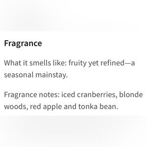 What it smells like: iced cranberries and red apple, blonde woods and tonka bean notes.