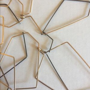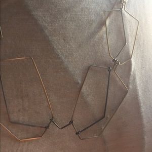 Gorgeous geometric necklace in gold-filled and silver metal with a lobster clasp closure. It is 20”-21.5” long when measured straight but on the neck the geometric pieces comes further into the neck which I️ tried to capture on the mannequin.