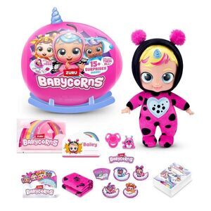 ZURU Babycorns Series 1 Small interactive doll, specifically the "Bailey" character, identified by her pink and black spotted outfit and unicorn horn.