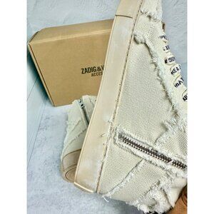 These Zadig & Voltaire high top sneakers are crafted from distressed canvas, offering a stylish yet laid-back appearance. The cream color adds a touch of sophistication, making them a versatile choice for casual outings. Detailed with branded laces and side zippers, these sneakers combine fashion-forward design with practicality. *Note French sizing is different from EU - see size chart in photos.