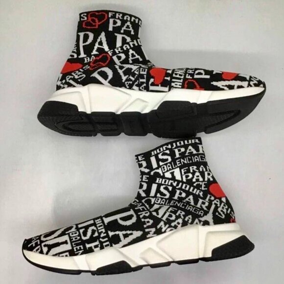 FEATURES: Luxurious Italian craftsmanship. High top, slip-on sock-sneaker silhouette. Technical jacquard knit upper with all over ‘Bonjour Paris France Balenciaga’ motif. Rounded toe-line. Bicolor, ultra-articulated molded sole unit, with “no memory” technology. Extra light; nearly barefoot-like feel. Embossed Balenciaga logo at rear on sole. Includes one Balenciaga shoe bag and all original packaging inserts.
