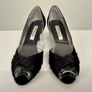 A pair of elegant black satin open toe Nina heels in women's size 8. These stylish pumps feature a sleek design with a high heel, making them perfect for adding a touch of sophistication to any outfit. The satin material adds a luxurious feel to the shoes, while the open toe adds a touch of allure. The Nina brand is known for its quality and attention to detail, making these heels a chic and reliable choice for any special occasion.
