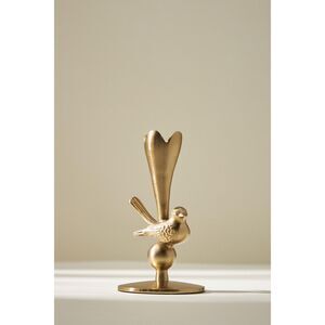 Featuring a perched sparrow, blossom-inspired design, and golden antique-brass finish, this enchanting candle holder lends effortless elegance to any countertop or dining table.