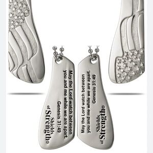 The distance between you and your loved ones does not feel as massive when you share the promise of God. When you look down at your half of the Shields of Strength stainless steel split shield 2-part necklace, you remember that God binds you together. One piece has the text of Genesis 31:49 inscribed on the surface, "May the Lord watch between you and me while we are apart" while the other features a waving American flag. This necklace is a great gift for best friends, parents and children, and the loved ones of those serving in the military. Shields of Strength is a Texas based Company. We stand behind our designs.