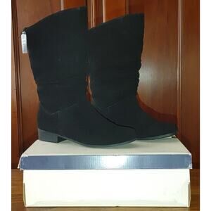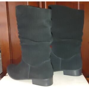 Elevate your style this winter and fall with these beautiful black St. John's Bay suede boots. The "Jamie" model features a low block heel, mid-calf shaft, and a round toe shape, making them perfect for everyday wear. These boots are made from real leather suede and come in size 9, with a B shoe width.