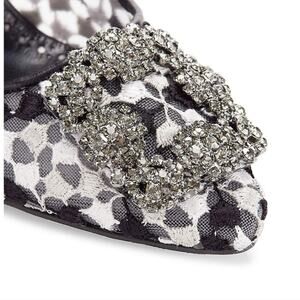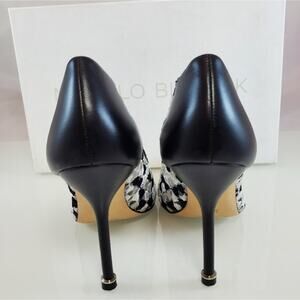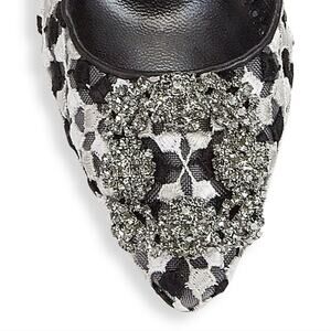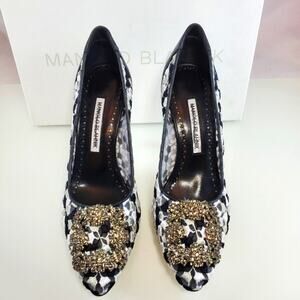 Crafted of elegant, embroidered lace with a smooth leather trim, these stunning pumps feature Manolo's signature square crystal-encrusted buckle encased in a gunmetal frame at the toe. Finished with a stiletto high heel.
