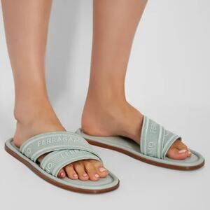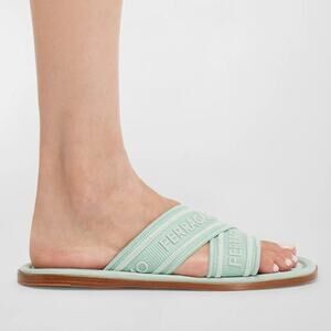 NIB$775 Ferragamo Laurene Logo Print Cotton/Leather Flat Slides Sandals