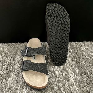 Enhance casual looks with the cozy, chic style of the Birkenstock® Arizona Happy Lamb sandal. Soft wool felt upper and lining features adjustable straps for a durable exterior and custom fit. Cozy textile based wool insole with contoured footbed. Flexible synthetic outsole offers lightweight, shock absorbing support with lasting durability. *Brand new in box. Authentic brand
