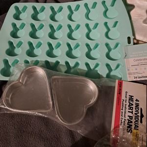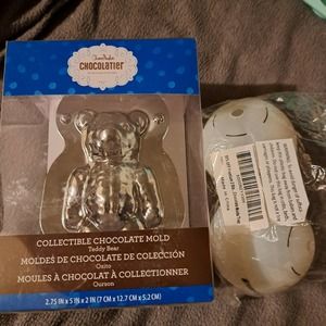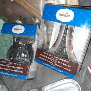 New in Boxes - Chocolatier Set includes 5-inch Eiffel Tower and 5-inch Bear Chocolatier molds by ChocoMaker Chocolatier Company PLUS Silicone Sheet of Bunny Molds made by Celebrate Co - Also an aluminum Sheet of stars still sealed by Williams Sonoma - 2 round fill them with surprises Chocolate candy molds made of Silicon and 4 hearts aluminum candy molds or cakelettes.