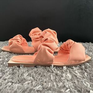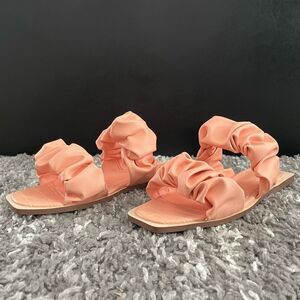 Circus by Sam Edelman®. Soft and lightweight, these ruffled sandals will bring some fresh attention with a touch of softness to your look. With square detailing and straps ruffled to the max, these slip-on sandals are anything but basic. Synthetic faux-leather upper, with ruched straps across the upper and vamp. Synthetic lining and insole with croc-embossed toe. Malibu peach color. *Brand new in box. Authentic brand