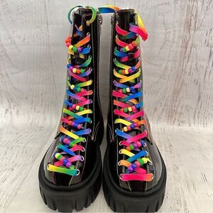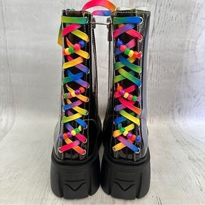 platform combat boots have a holographic vinyl construction, side zip closures, extra long rainbow ombre laces on the front and back, and sweet little kandi beads scattered all over