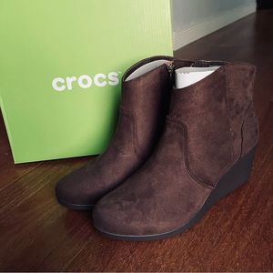 NIB Crocs Leigh Synthetic Suede Wedge Bootie 8 Expresso Standard Fit