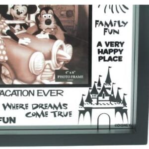 Slide out panes to insert your photo, then enjoy the magic! Screened line art on glass features Mickey Mouse, Sleeping Beauty Castle, fireworks, balloons and Disney Parks phrases Your 4'' x 6'' photo sticks between the two glass panes Slide glass out on bottom of frame to remove panes and insert picture Black wood frame with matte finish Glass/wood Exterior frame dimensions 8 3/4'' H x 10 3/4'' W x 1 1/2'' D Fits 4'' H x 6'' W photo new with box