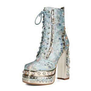 GORGEOUS well made & well-designed in the color of SOFT SERENITY TEAL - embellished with large overstated faux diamonds around the op of the sole and golden sequins plus fun and fabulous embroidered flowers well placed over the boot. I personally own 4 pairs of these boots and I LOVE them! They are actually VERY comfortable and so easy to show off! BE FABULOUS in these works of art! They are head turners...
