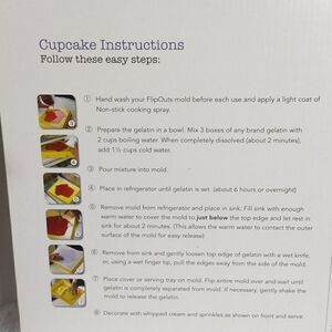 This New in Box Flip Outs Cupcake Gelatin Mold measures approximately 12-1/2" x 10". Contains one cupcake gelatin mold with cover and serving tray. All offers welcome.