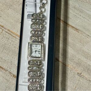 Perfect for the gardener! A designer Jennie B silver watch with floral design and rhinestones. Features a square face with Roman numerals.