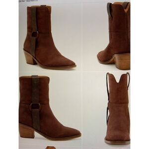 NIB Lucky Brand Kamaree Bootie. Suede upper pull-on. Approximately 6.7”shaft. Approximately 11” leg opening. 2.4” stacked block heel. Color is chocolate.