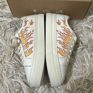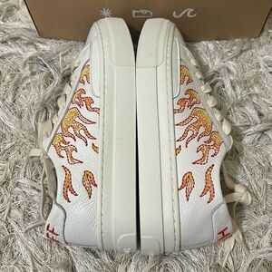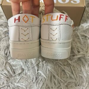 Upgrade your casual shoe game with these limited edition Soludos Hot Stuff sneakers. The white leather upper features eye-catching embroidered flames with a classic round toe shape and ankle shaft style. The tie closure ensures a snug fit, making them pertect for travel and everyday wear in the summer or spring. The low heel height and rubber outsole provide comfort and traction, while the synthetic lining and fabric insole keep your feet cool and dry.