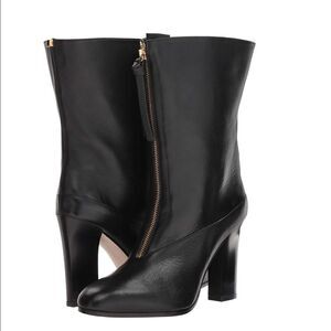 Done in rich lambskin leather, this gorgeous boot features an exposed zipper with a tasseled pull that beautifully highlights the style's wider topline.