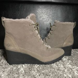 Create the look you want with the UGG® Bridgit ankle bootie. Lace-up wedge boot features a waterproof suede upper with a sheepskin lined tongue and top collar for warmth and comfort with 200g insulation included. Cushioning foam lined with 7mm curly UGGpure™ wool insole. Rubber wedge; molded Spider Rubber outsole for traction and comfort. Seam-sealed waterproof construction. Heel height 2.5”. Shaft 5.5”. *Brand new in box. Authentic brand
