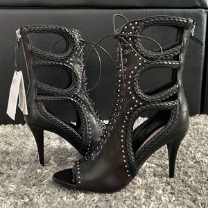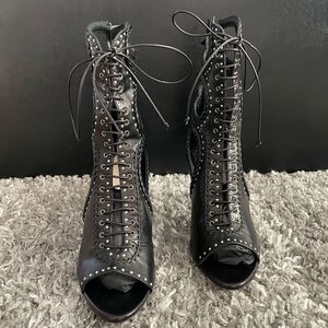 Part of the spring/summer 2022 runway collection. Heeled sandal booties made of leather with studs and opening at sides. Back zip closure and laces at front. Airfit technical flexible latex foam insole designed to offer increased comfort. Upper, lining and insole made of 100% goat leather. Sole 100% vulcanized rubber. Heel height 3.5”. *Brand new in box. Authentic brand